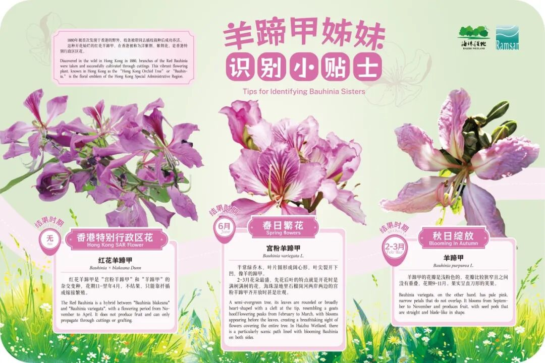 宫粉羊蹄甲:春日繁花,约2至3月花朵繁盛,约6月结果时期,半常绿乔木,叶片圆形或阔心形,叶尖裂开下凹,像羊的蹄甲。先花后叶的特点就是开花时是繁花满枝。海珠湿地里石榴岗河两岸两边的宫粉羊蹄甲齐开放时颇为壮观。