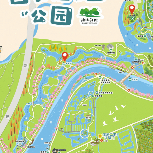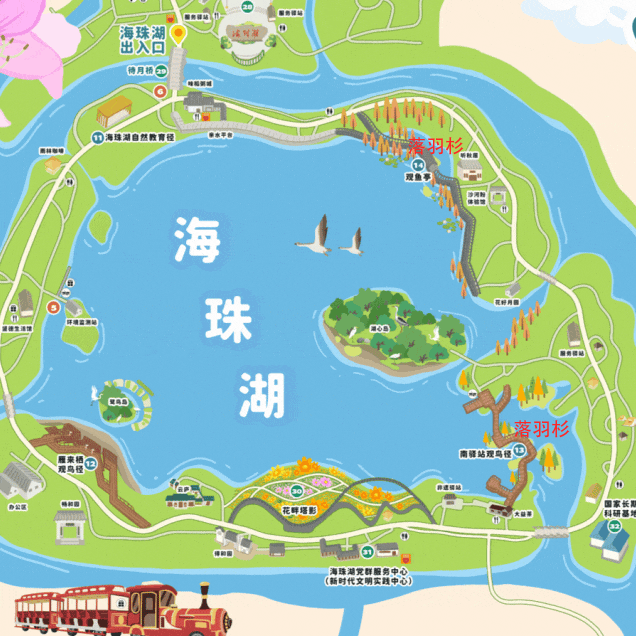 游船路线:以海珠湖码头为起点和终点,途经海珠湖鹭鸟岛、湖心岛、观鸟栈道、花畔塔影等多个人气景点。
