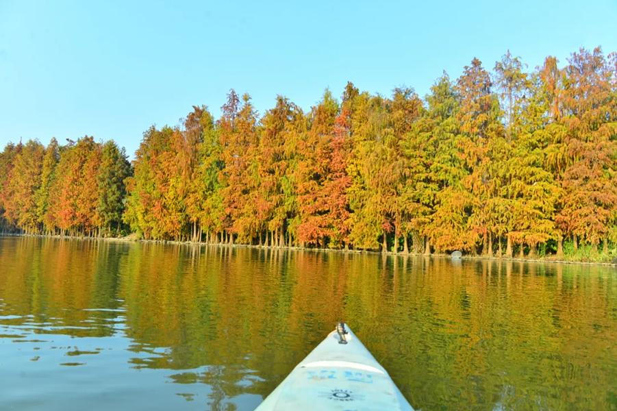 杉林:聚龙湾的杉树温柔环抱着内河道,焦糖色枝叶垂落水面,阳光透过缝隙洒下金芒,绿水红杉相映,仿若走进童话意境,棕红的树干倒映在碧绿的水中。