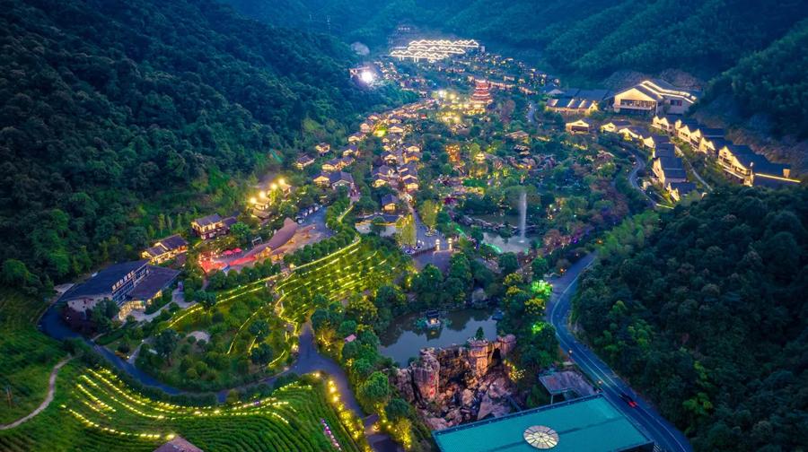 茶园位于圆方上方山坡,采茶时节游人采茶成别致景致。夜晚全息投影技术打造仙人抚琴场景,科技灯光与森雾带来仙雾缭绕的游玩体验。