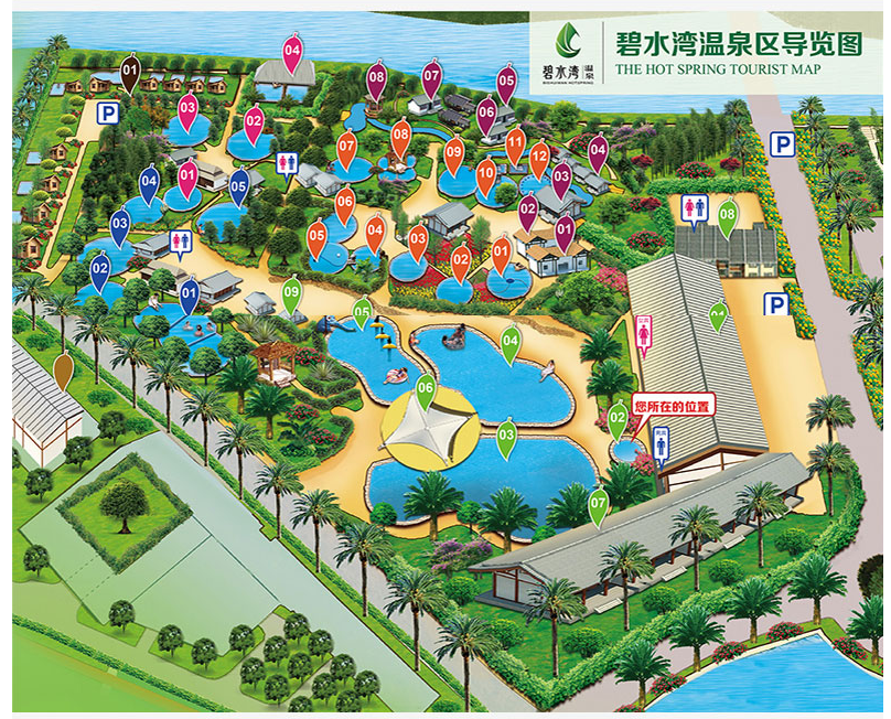 从化碧水湾温泉,属于优质的低氡小苏打温泉,富含二十多种有益人体矿物质与微量元素,另一处同类温泉则位于瑞士。四周层峦叠嶂,树木葱郁,采用园林式设计,汤池错落有致,分布在绿荫曲径间,落日余晖洒落池面,伴着流水声泡温泉,环境优美宜人。总占地约200000平方米,建筑面积约4万平方米。