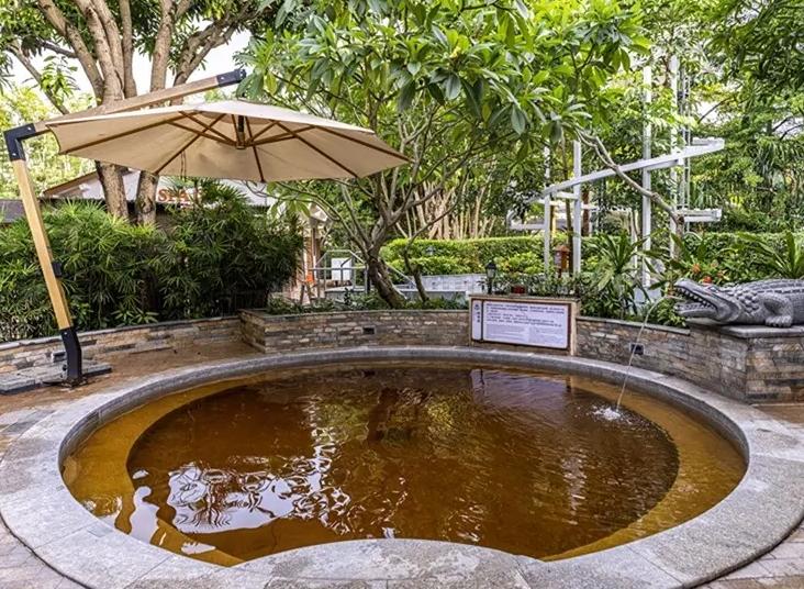 出水口温度约71摄氏度,水质优良。拥有40余个风格迥异的汤池,特色的温泉浴池,包括三叠泉、泡泡泉、酒温泉、会议观景池、冰火池、茶浴池、玫瑰花瓣池、三味美颜池、香薰池、梦幻水疗池、浮力按摩池、艾叶池、泡泡池、鱼疗、石板浴、对弈池、强身益智池、户外游泳池、河畔无边际泳池,红外线桑拿、干湿蒸汽房等。