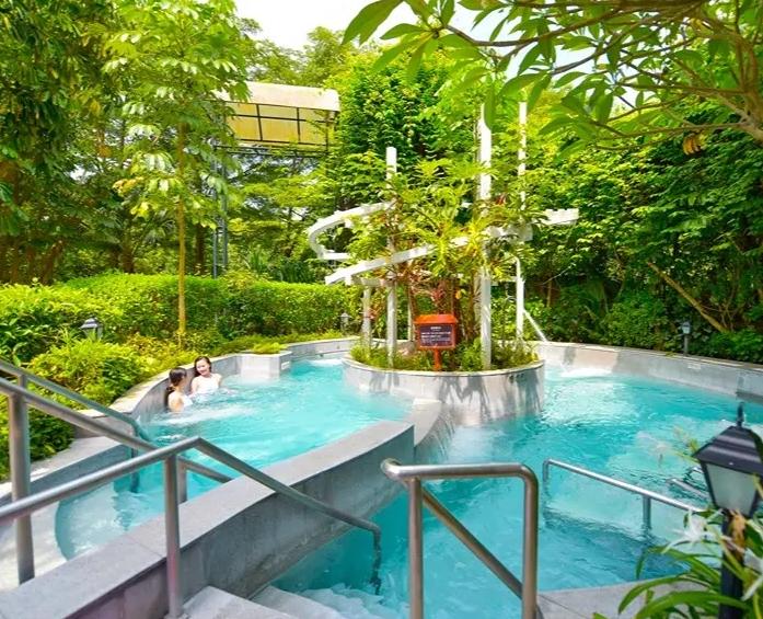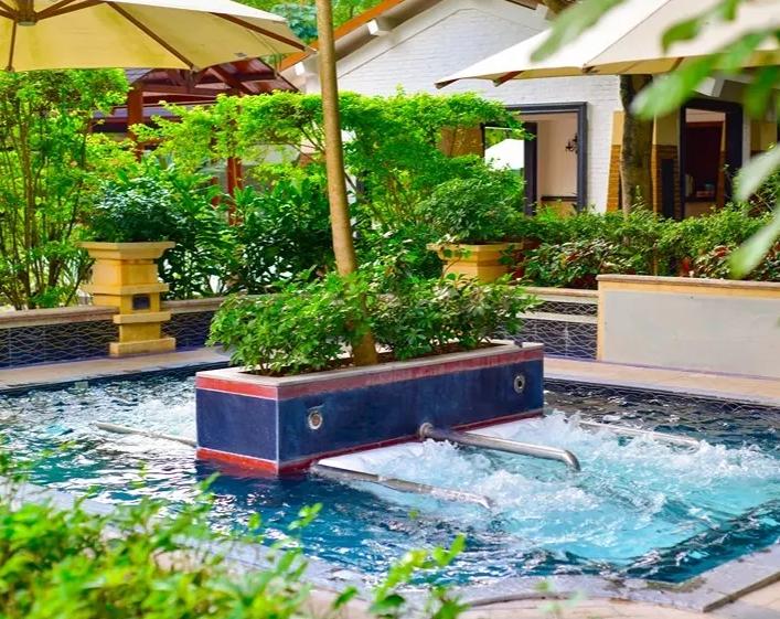 从化碧水湾温泉拥有40余个风格迥异的汤池,如药浴的温润、梦幻水疗池的舒缓、玫瑰花瓣池的浪漫、三味美颜池、香薰池、浮力按摩池及冰火池等。亲子家庭尤为喜爱趣味亲子泡泡泉、土耳其及印尼鱼疗池,河畔无边际泳池。