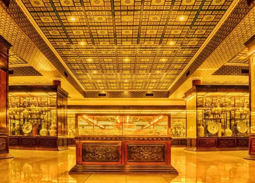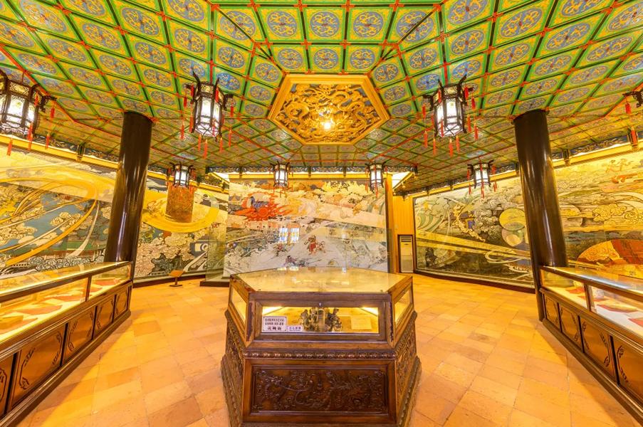 大厅四角摆设四个巨型花瓶,瓶身绘画及诗词分别反映春夏秋冬四季景色。屋顶悬挂宫灯。室内正中摆设了一座长约2.36米、宽约1.6米、重约1吨,上面刻有千姿百态的瑞鹤108只,取名“百寿图”的巨型端砚。两旁玻璃柜则分别陈列着清康熙年间的“如意古墨”以及大型紫檀木雕画筒。