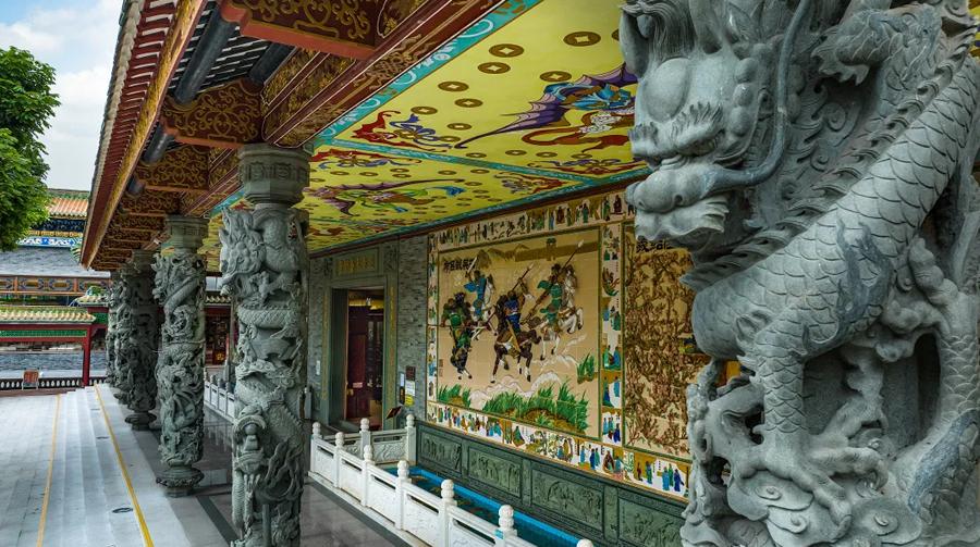 大型铜雕工艺精品“灵猴献寿”取材于中国四大名著之一《西游记》,全塑约38吨高纯度、强韧性的铜所铸,贴999金箔。铜雕四周种植数十棵百年老荔树,荔枝成熟后如同一片红云,此景以岭南佳果映衬匠心工艺,更显岭南文化的独特魅力。
