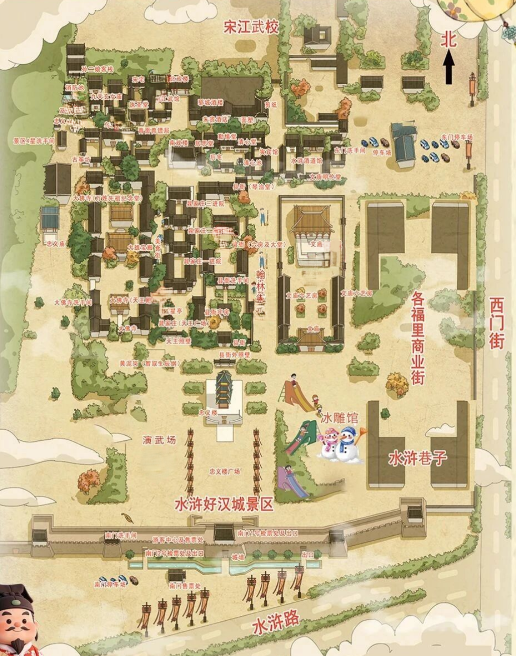 水浒好汉城,《水浒传》的故事就起源在这里。水浒好汉城占地面积约400亩,包含36院落、72景观、108个景点,规模宏大。景点如忠义楼、郓城县衙、晁家庄、郓城文庙、宋江武馆、郓城酒楼、及时雨茶楼、孙二娘客栈、古筝坊、大刀馆、乌龙院、寅宾馆、明伦堂、明清戏楼等景点。北方传统四合院和浙派、徽派的古代建筑荟萃等,狗娃的精彩表演和重二百多斤的状元大刀绝技,使人倍感震撼。