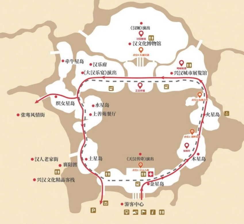 《天汉传奇》200多名演员在汉源湖水面上倾情表演,是一部大型汉文化水上实景演出,以“汉水神女”为主线,通过“敬天祈福、神女降临、宣威怀远、大汉荣耀、汉人老家”五个篇章讲述了两千年前辉煌的大汉盛世。由约3000平米巨型全息水幕结合无人机、烟花秀等科技手段,呈现出一幅汉文化的传奇画卷。演出场面宏大、视觉效果震撼,是值得一看的精彩节目。
