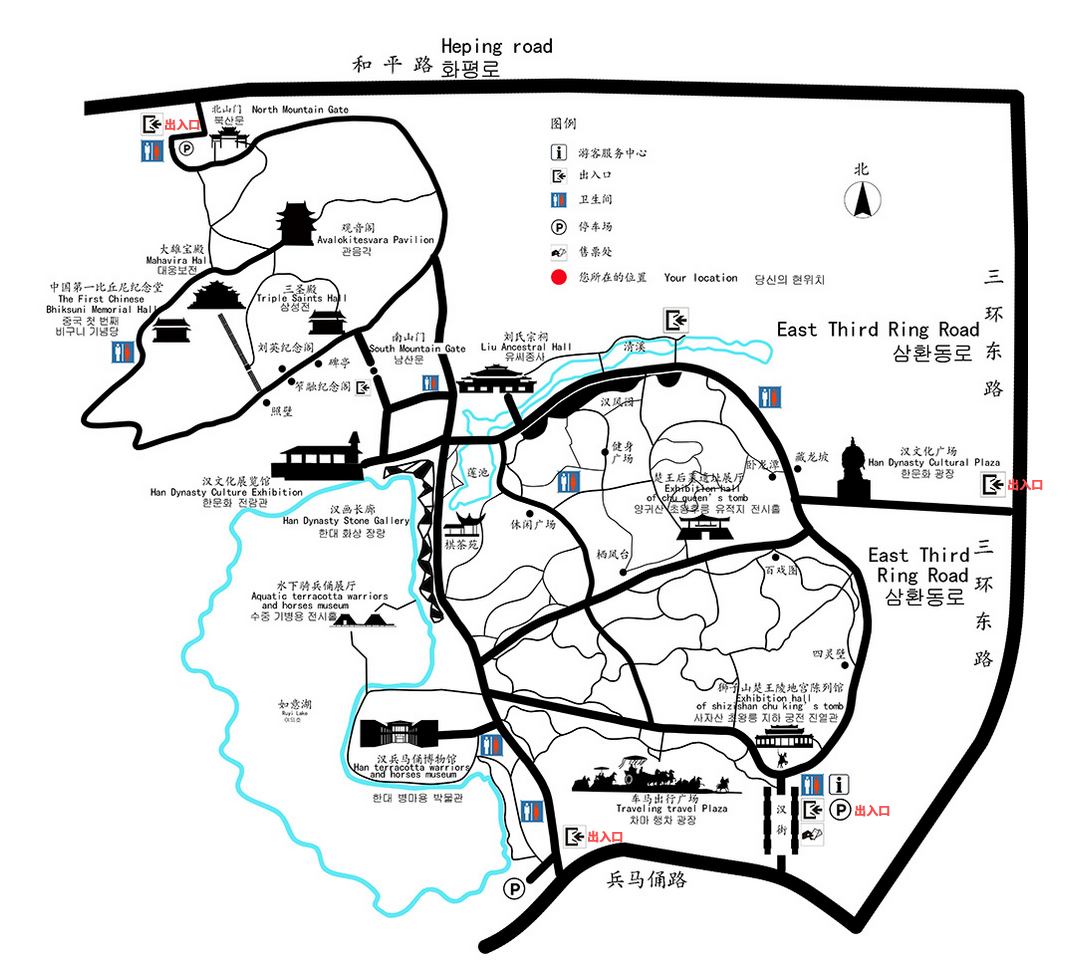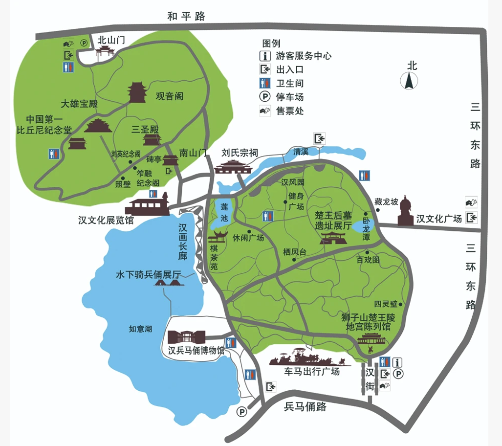 南门进去是狮子山楚王陵,陵前立着楚王骑着战马的雕像【南门进去是主要的景点,一般从南门进景区开始参观。】;