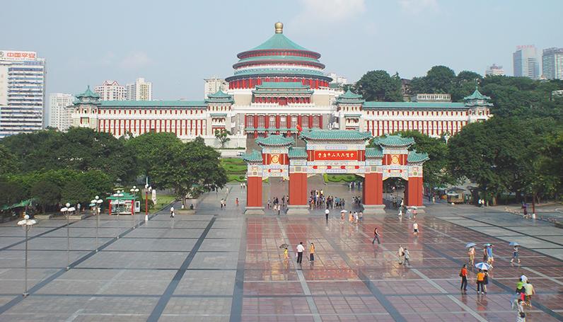 重庆市人民大礼堂,一座具有中国民族与地方特色、雄伟壮观、精致典雅的建筑群体。占地面积约为6.6万平方米。仿古民族建筑群,中国传统宫殿建筑风格与西方建筑的大跨度结构巧妙结合。由大礼堂和东、南、北楼四大部分组成。