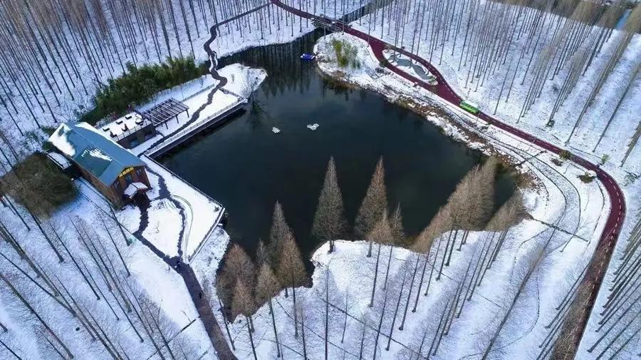 全长约2公里,悬空于水杉林之上,从栈道上俯瞰湿地长廊风光带中的花草争妍斗艳,抬头可感受到天即为树、树即连成天的独特之美。