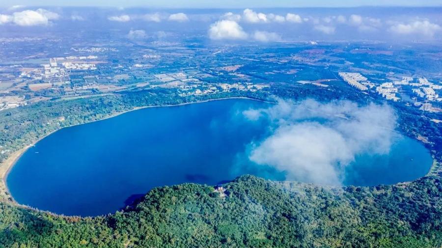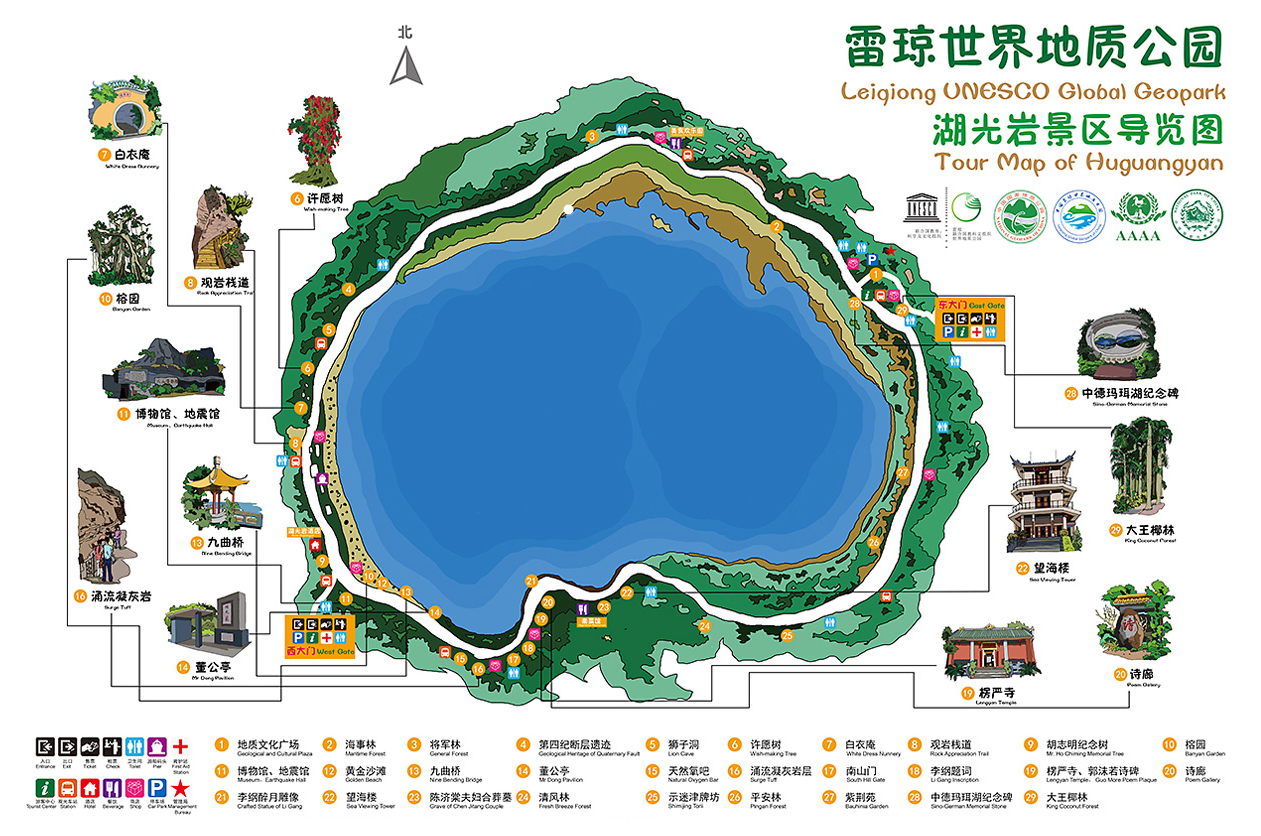 湖光岩风景区,距市区约18公里,景区总面积约4.7平方公里,其中湖面积约2.3平方公里,地质公园以火山口和湖周围的环形火山丘地质遗迹为主。植被覆盖率约97.17%,景区内古树参天,古藤缭绕,植被茂盛,为游客提供了一个清新宜人的游览环境。湖光岩玛珥湖与德国艾菲尔地区玛珥湖是世界上罕见的不可再生的地质资源。目前两湖都是世界闻名的火山地质风景区。