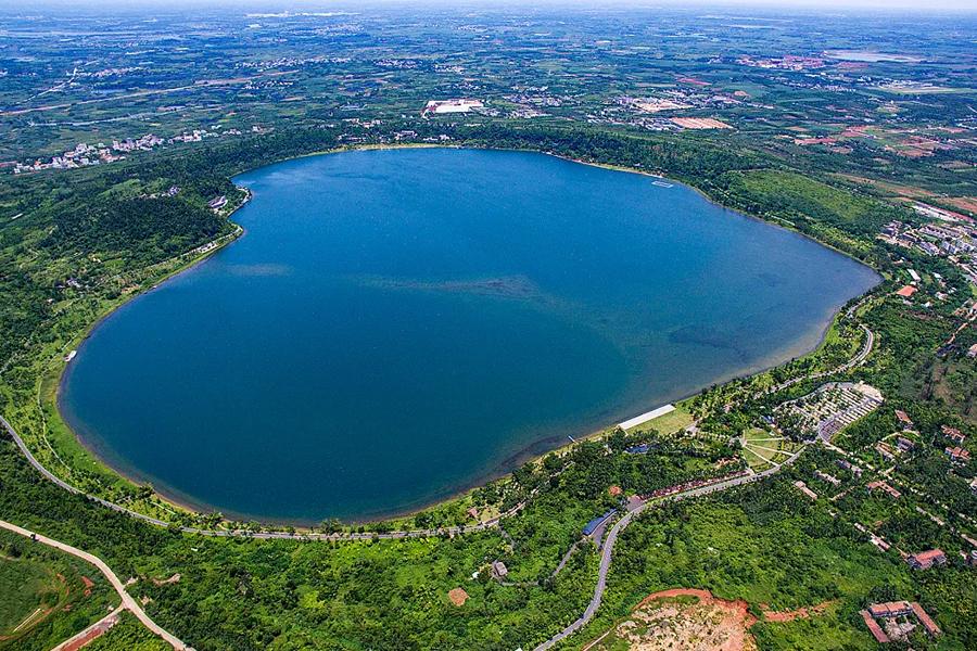 分东西两湖,东湖小,西湖大,玛珥湖是湖光岩风景区的核心景观之一,形成于14-16万年前的火山喷发,是世界上保存较为完整的火山口湖之一。湖面呈“心”形,湖深约400米,东西方向约长1.9公里,南北方向约宽1.4公里,面积约2.3平方公里,湖水清澈如镜,具有“大旱不干,久雨不溢”的特性。湖中无蛇、无蛙、无蚂蟥等。湖底沉积物厚约50米,真实记录了10多万年来古气候、古环境的变化情况,被联合国专家称为地球科学“天然年鉴”。