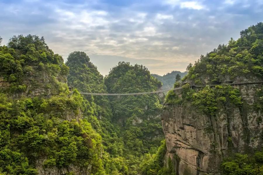 在马鞍峰和天蚕峰之间有一座凌空驾起的吊桥,约30米长,绳索连接着木板铺就而成的桥面,晃晃悠悠地通向了对面山峰。在桥上看风景,视野十分开阔,两边的山一直蔓延着同远处的融在了一起,化成了一团茫茫的水彩,桥下的韩妃江蜿蜒而过,山底的村落和农田在这里可一览无余。