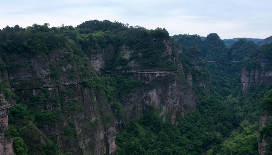 全长约3200米,由古木栈道、玻璃栈道和飞龙天桥三部分组成,悬于山体约200米高空,垂直山体尽收眼底,惊险刺激。栈道蜿蜒曲折,沿途可观赏丹霞峰林、峡谷溪流,终点连接飞龙天桥(长约130米,高约150米),行走其上如凌空漫步。