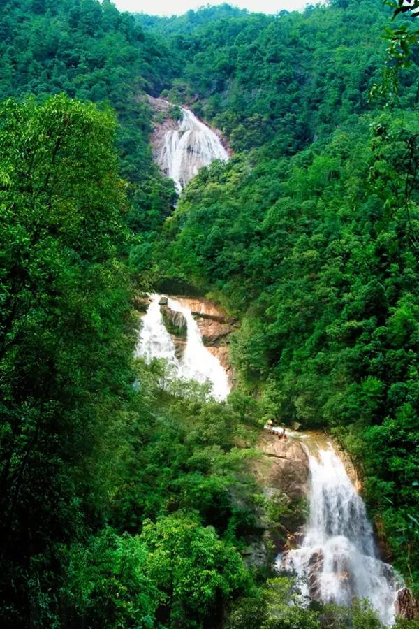 瀑形如绸缎倾泻,绵延百余米,从高山之顶奔流而下,两折叠飞,气势壮观,瀑似飞银,激荡的水雾扑面而来。瀑前古树被誉为“多子登科”树,寓意吉祥。