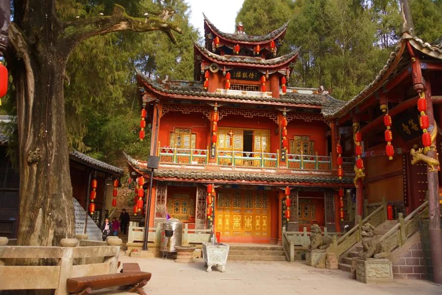 现存约500米石板古街,街道两旁穿斗结梁的古建依旧,蜀道风情尚存。古街中段耸立着古镇的标志性建筑——奎星阁(又名钟鼓楼、财神楼),此楼为三层全木结构穿街楼台,高约15米,底层为青石板街道穿楼而过,中层为戏楼,顶层供奉奎星,兼具奎星楼与戏楼功能,是古镇的文化娱乐中心。