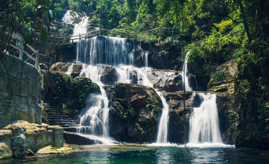 瀑布约从40米高的崖顶倾泻而下,水雾扑面,清凉宜人。孙中山先生曾在此游泳,现崖壁上刻有宋庆龄手书的“孙中山游泳处”。