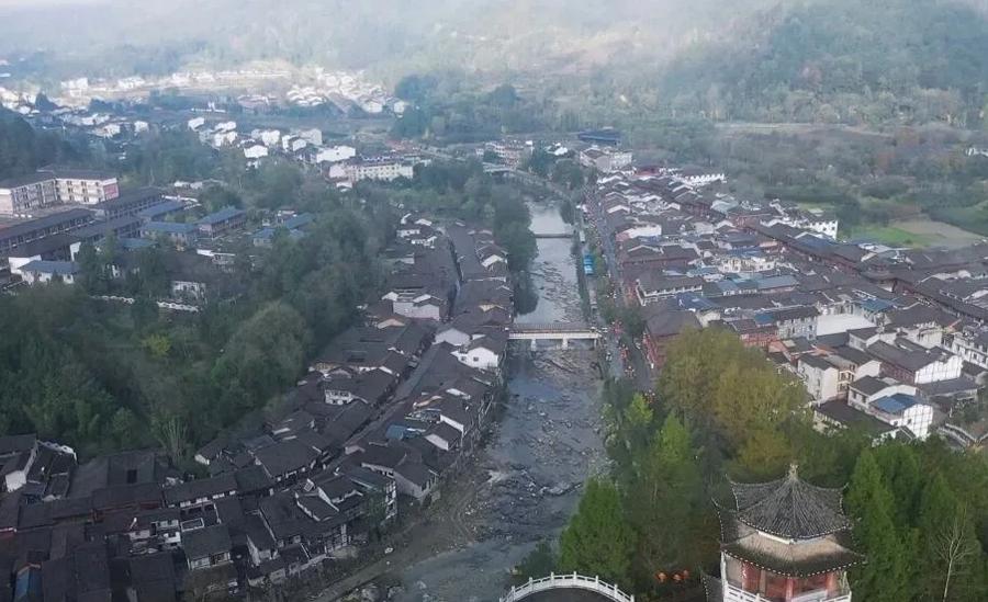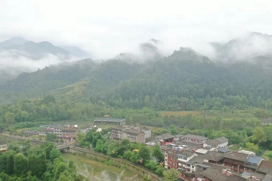 青木川古镇,始建于明清时期。金溪河水穿镇而过。“一脚踏三省”的独特地理,造就了文化交融的建筑风格。陕南的敦厚、川地的灵巧、陇上的粗犷在此交汇。古镇周边被高山峻岭围合,森林覆盖率较高,分布有金丝猴、羚牛等国家级保护动物。