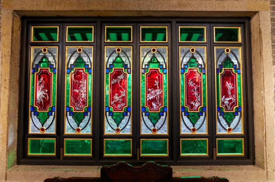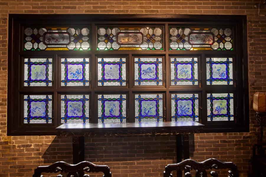 满洲窗:是中西合璧的典范,由清末的能工巧匠把西方套色蚀刻玻璃技术融入中式传统窗棂结构而成。满洲窗色彩斑斓、流光溢彩,让人透过窗户就能看到一年四季的景色变幻,梁园的满洲窗图案更是丰富多样,既有花鸟鱼虫的自然灵动,也有博古器物的文雅端庄,更有冰裂纹、祥云纹等寓意吉祥的几何纹样。迷人的特点,在于色彩与光影的游戏。窗户以黄、红、蓝、绿为主色,辅以紫、金,营造出流光溢彩、美轮美奂的效果。透过满洲窗,窗外景致随琉璃变色——嫩绿绽春芽,金黄染秋叶,青蓝凝冬雪,一窗之间,便可览尽岭南四季流转。