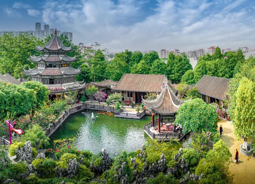 余荫山房,与清晖园、可园、梁园齐名,岭南四大园林之一,四大名园中保存原貌较为完整的一座。余荫山房为清代举人邬彬修建的私家花园,建成于清朝同治十年(1871年),距今已约有150年的历史。余荫山房面积约为1.4万平方米,布局精巧“藏而不露,缩龙成寸”,将亭台楼阁、山石池桥尽纳于方寸之地,形成“园中有园、景中有景”的绝美佳境。以浣红跨绿廊桥为界,分为东西两区。东区有玲珑水榭、卧瓢庐;西区有深柳堂、临池别馆。