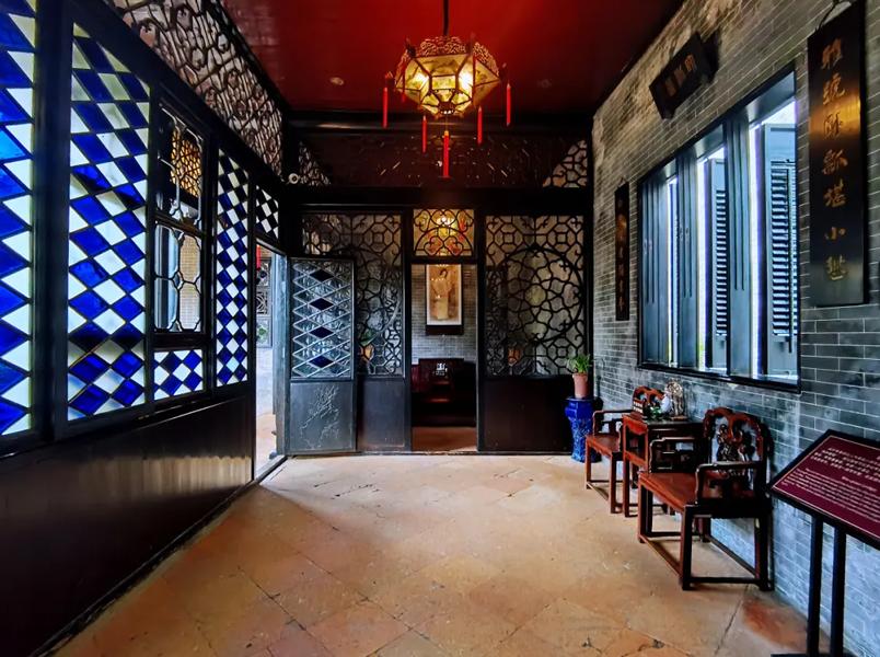 馆内朴素简洁,与深柳堂形成鲜明对照。外观新颖,明间以细密的冰纹花隔断涂金假窗装饰。