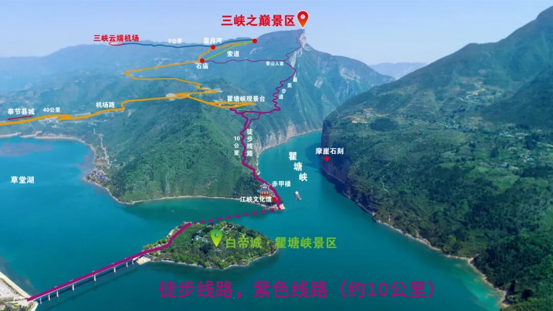 经典路线:白帝城、江峡文化馆、瞿塘峡观景台、三峡之巅,全程约10公里,设“520”“1314”等网红打卡点。