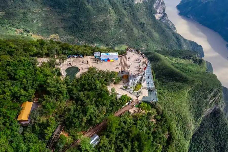 彩云台是三峡之巅大型的观景平台,可环视四周,欣赏不同季节的壮丽景色,春天山花烂漫,夏天绿意抒怀,秋天满山红叶,冬天遥望山巅白雪皑皑。海拔1388米的三峡之巅,站在玻璃栈道上俯瞰瞿塘峡,云雾中赤甲山如巨剑刺天立。