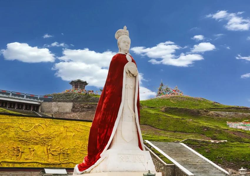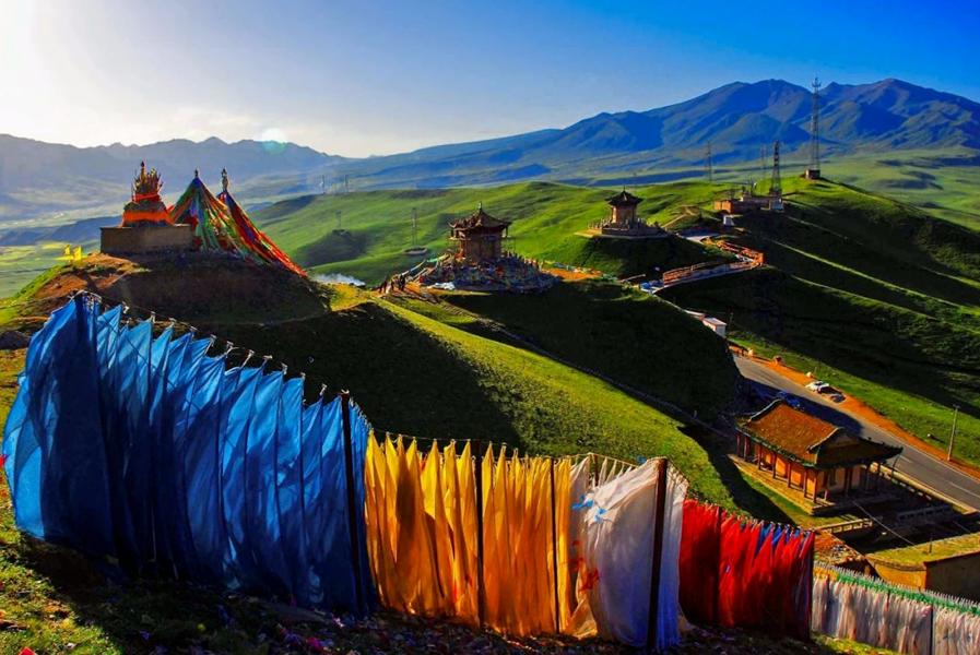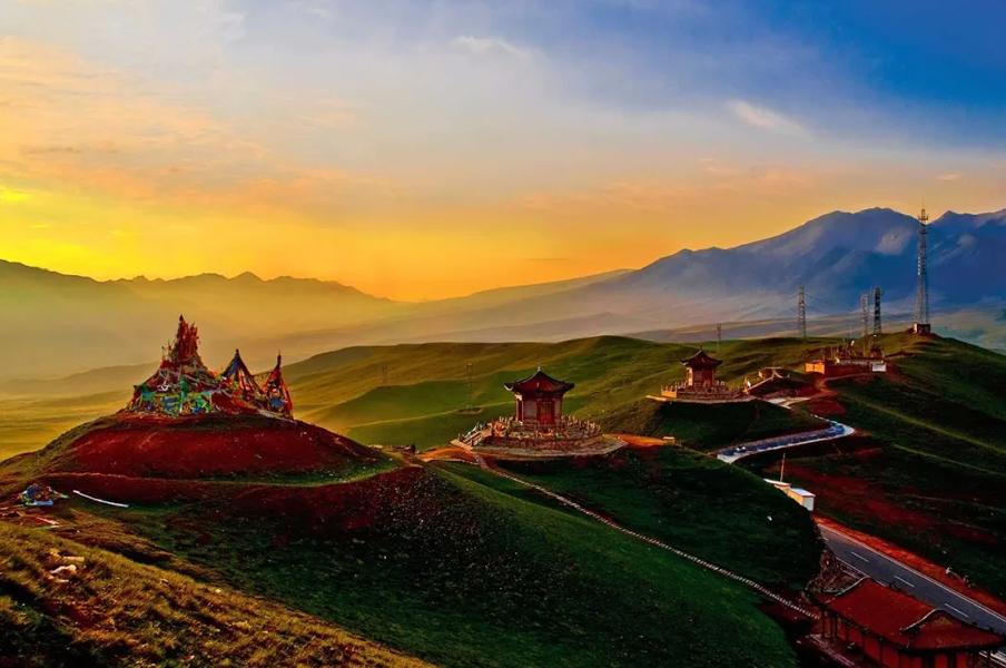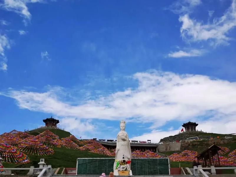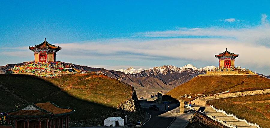 日月山山口建有日亭、月亭、公主塑像、浮雕墙等。日月山两侧景色迥异,东侧是农耕区田畴纵横,绿荫蔽日;西侧则是草原牧区,广袤无垠,牛羊成群。6<span>-</span>9月是游览适宜时期,此时草原绿意葱茏,野花灿烂,油菜花大片开放。