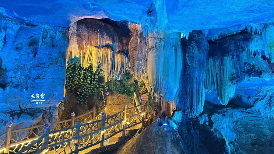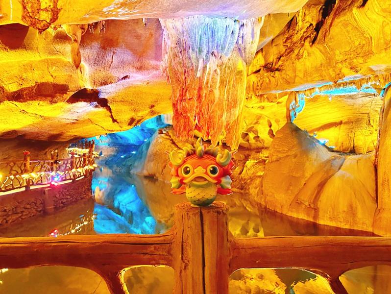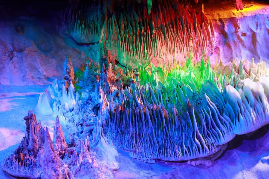 鱼龙洞,洞体全长约5000米,以“水陆并行”的奇幻景观著称。溶洞“洞中有洞、洞洞相连”的独特结构展现得观感出彩。洞内空间变化多端,最高处约23米,而最狭窄处仅3米宽。洞内景观丰富多样,洞内遍布千姿百态的钟乳石、石笋和石幔,万年钟乳石幻化出琼楼玉宇的模样,飞瀑流泉般的石幔静静诉说着时光积淀的自然风貌。在精心设计的灯光映照下更显神秘。常年流淌的地下暗河,可乘船进入幽深的洞穴。