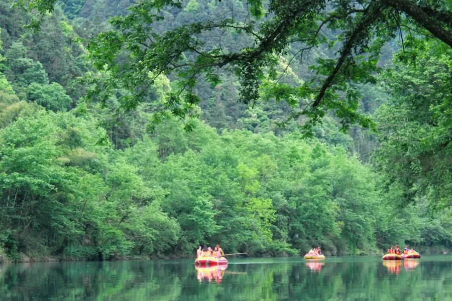 秋浦景区,泛舟秋浦,乘坐竹筏感受春意盎然的景致。