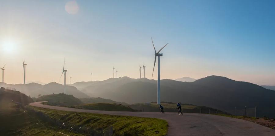 草原山脊上矗立着蜿蜒绵长、高耸入云的动力风车,白色风车与碧绿草地相映成趣,构成了独特的草原胜景。