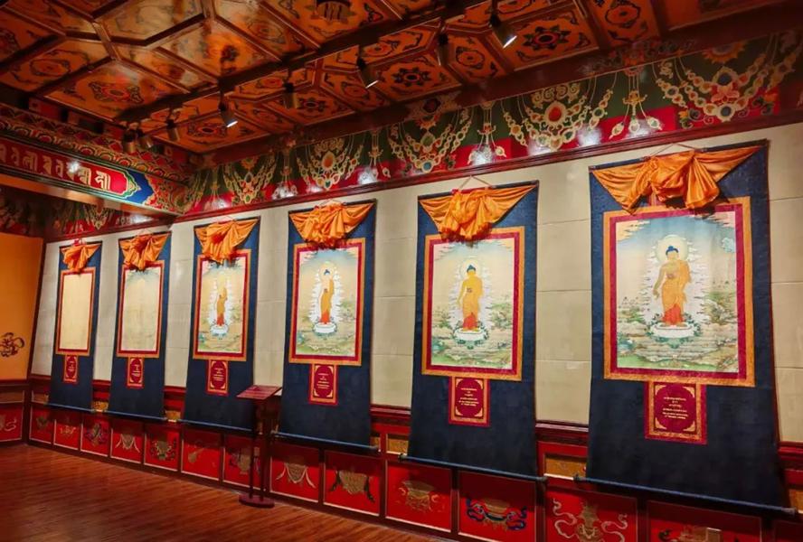 五楼唐卡展示厅展示着上千幅唐卡,这些唐卡历经1300多年的岁月洗礼,笔触间流淌着画师对艺术的执着。每一幅唐卡都是一个故事,从古老传说到历史人物,从神话世界到现实生活,无不展现着藏族人民非凡的想象力与精湛技艺。其中,有一幅拥有600多年历史的名为《阿底峡》的唐卡,是已失传的宁玛画风,画里面端坐的阿底峡大师是藏传佛教噶当派的奠基人,整幅唐卡里涵盖了噶当派的所有传承大师、高僧大德,是香巴拉时轮坛城景区年代久远、内容丰富、价值珍贵的唐卡,被誉为镇馆之宝。
