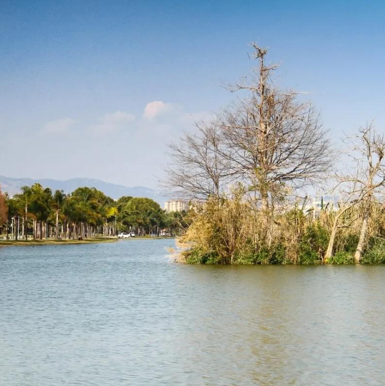 人工湖面广阔,波光粼粼,是园区的核心景观。湖中设有多个小岛,通过桥梁与湖岸相连,增添了景观的层次感。园区内生长约有500种植物,包括红豆杉、香樟树、桫椤等国家保护植物,形成了优美的自然环境。园区是多种水鸟的栖息地,包括白鹭、黑天鹅、红嘴鸥等十余种野生鸟类。湖泉生态园可驱车游湖,也可骑车绕湖,健康步道为石板路面,亦步亦趋感受生态园的美景。
