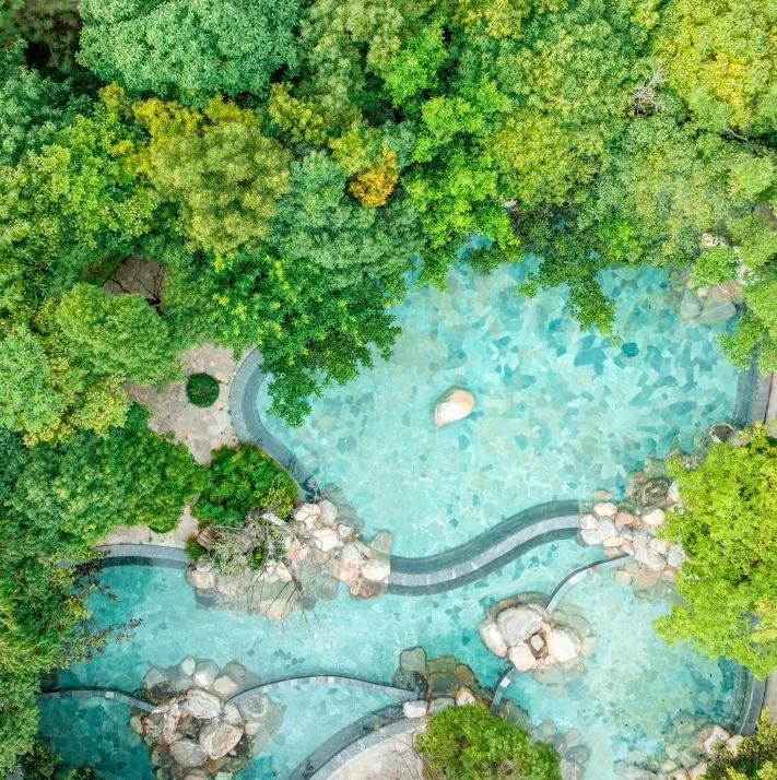 半山温泉约有34个泡池半山温泉,园区整合了原有天然温泉资源,形成了温泉浴场,泡池各具特色,如云瑶池、玫瑰池、山顶无边池等。