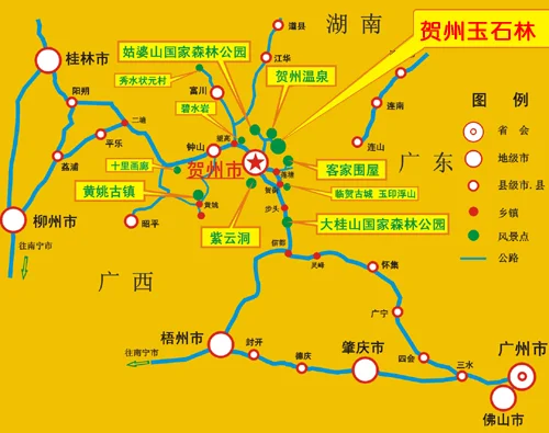 自驾:两广、贵广、包茂、汕昆、贺巴、永贺(道贺)等高速路可直达贺州玉石林。