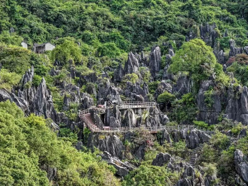 玉石林风景区,距离市区约18公里。景区面积约45公顷,观赏景点百余处。形成于一亿多年前的侏罗纪时期,是一片比较独特的由汉白玉石柱、石笋组成的“玉石林”。层峰丛间石芽裸露、奇峰突兀,石笋石柱、地槽漏斗、狭缝密布,成就了“南国雪原、石林迷宫、空中走廊、一线天、仙羊回头、石亭三远”等众多的特色自然景观。