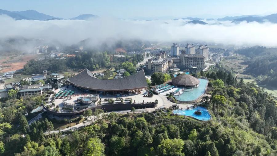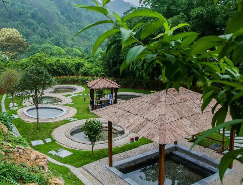 整个温泉区分布在森林自然美景之中,森林覆盖率高,空气清新,温泉与自然景观较好融合。泡池种类多,中医药池、瑶药池、原汤池、石板浴、艾草房、全盐房、叠水瀑布温泉、在山顶无边际温泉池,可俯瞰梯田和古村落全貌。