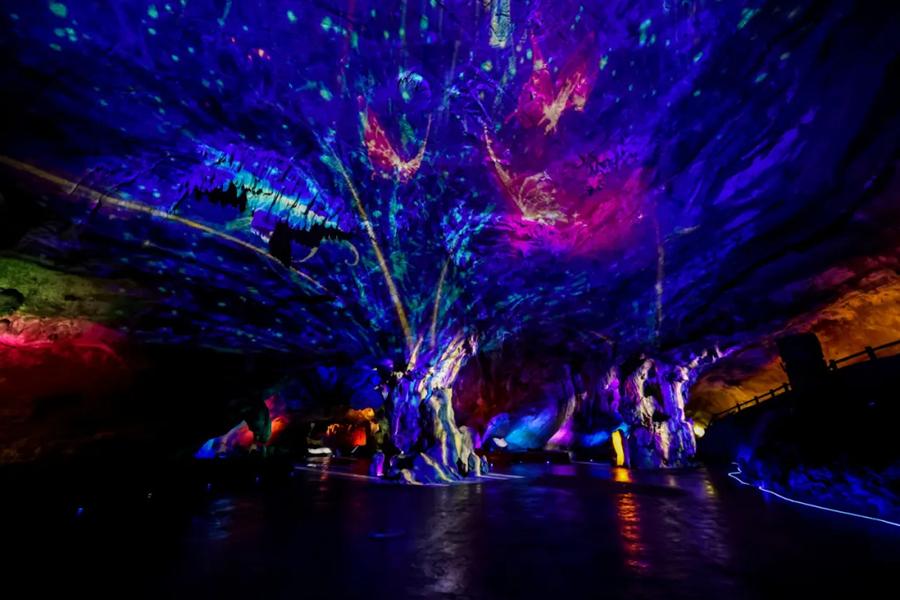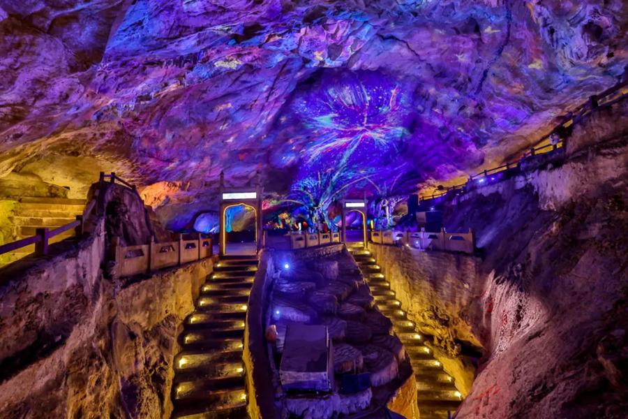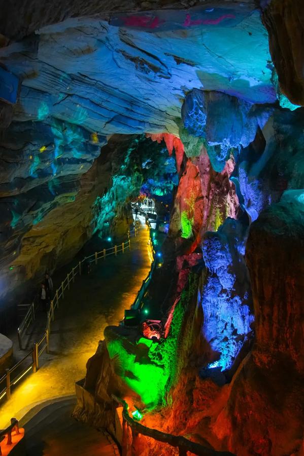 踏入溶洞约7米高钟乳石率先闯入视野。上洞云雾缭绕,洞顶岩石如扩散的云雾,各种动植物形态的钟乳石让人不禁感叹大自然的神奇。中洞宽敞明亮,是天然的大石厅。下洞洞天相接,悬崖飞瀑直泻而下。洞中还有地下暗河。