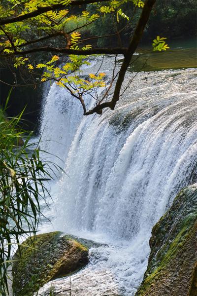 若渐渐走近,来到瀑布前, 则听见隆隆水声, 如雷过顶。