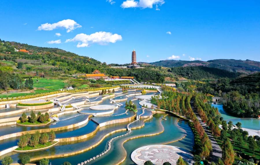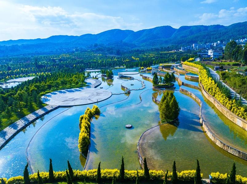 沿着入口处的古风古韵长廊走,可一览湿地美景,往两边看溪水瀑布涓涓流淌,鲜花绿树绕河生。是一条风景优美的河流,河流两岸绿意盎然,适合徒步和骑行,沿途可欣赏多样植物。河流周边设有野餐和露营地点,也是垂钓地点。