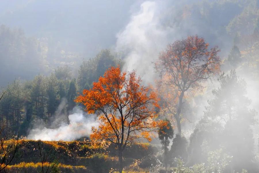深秋初冬时节,红枫黄叶最为灿烂,沿途植被茂盛,数百株枫香遍布古道两旁,是一条很壮观的红枫古道。观景台可俯瞰广袤大地与连绵起伏的山峦。古道附近的小石桥,东、西桥头各有一株高大的小叶榕,著名的“夫妻榕”。