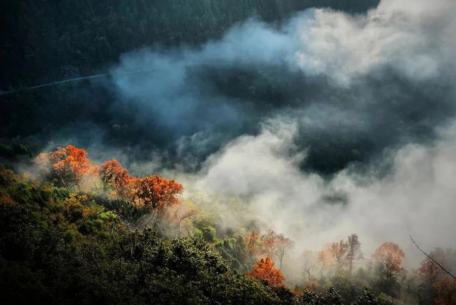 沿着古道漫步,植被丰茂,树木遮天,欣赏到美丽的红枫景观,古道沿途还有农家乐等休闲设施。秋季是观赏红枫的最佳时节,此时枫叶如火,景色宜人。红枫夏可遮阴,冬叶落了又可暧阳。白云庵悬崖绝壁之上仿佛高筑于白云间。